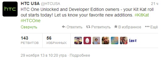 Вчера, вопреки всем ожиданиям, владельцы HTC One получили подарок от производителя. Компания HTC начала распространение Android 4.4 KitKat на свои флагманские смартфоны. Ранее поступала информация, что обновление будет доступно только в конце января 2014 года. По актуальной информации, компания HTC планирует к новому году обновить большинство своих HTC One до новой версии Android. Так же с новой версией мобильной операционной системы, на смарфоны устанавливается обновленная оболочка HTC Sense 5.5.