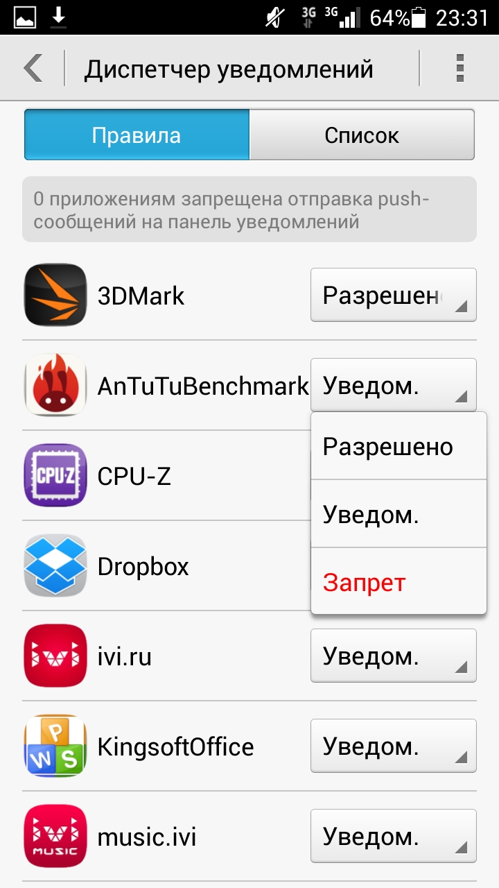 Аналогичным образом в Emotion UI 2.0 работает диспетчер уведомлений, который позволяет, не заходя в меню «Приложения», разрешить или запретить программам отправлять уведомления.