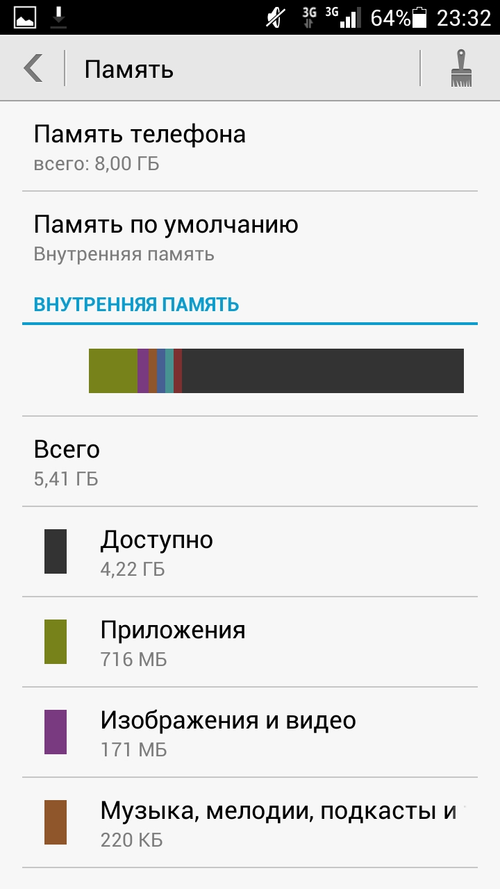 Объём установленной в смартфоне памяти — 8 ГБ. Как это обычно бывает, часть её занята под нужды операционной системы, так что пользователю остаётся только 5,4 ГБ для установки приложений и хранения своих файлов. Расширить этот объём можно с помощью microSD.