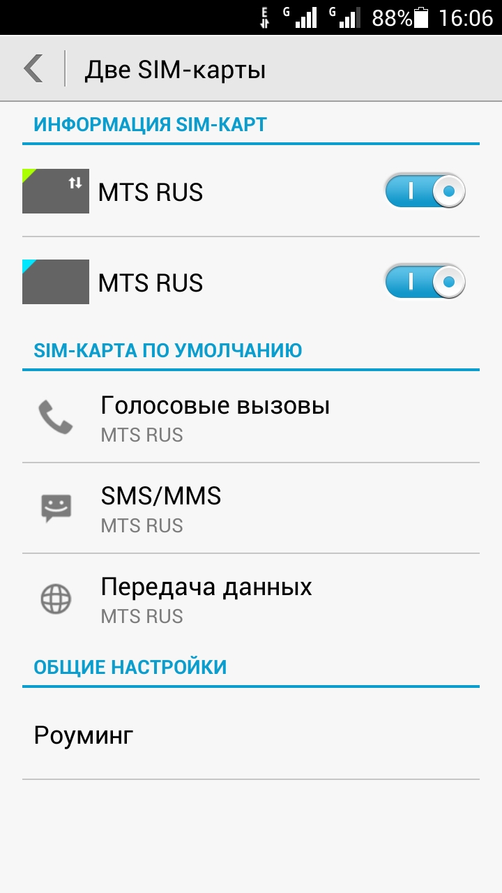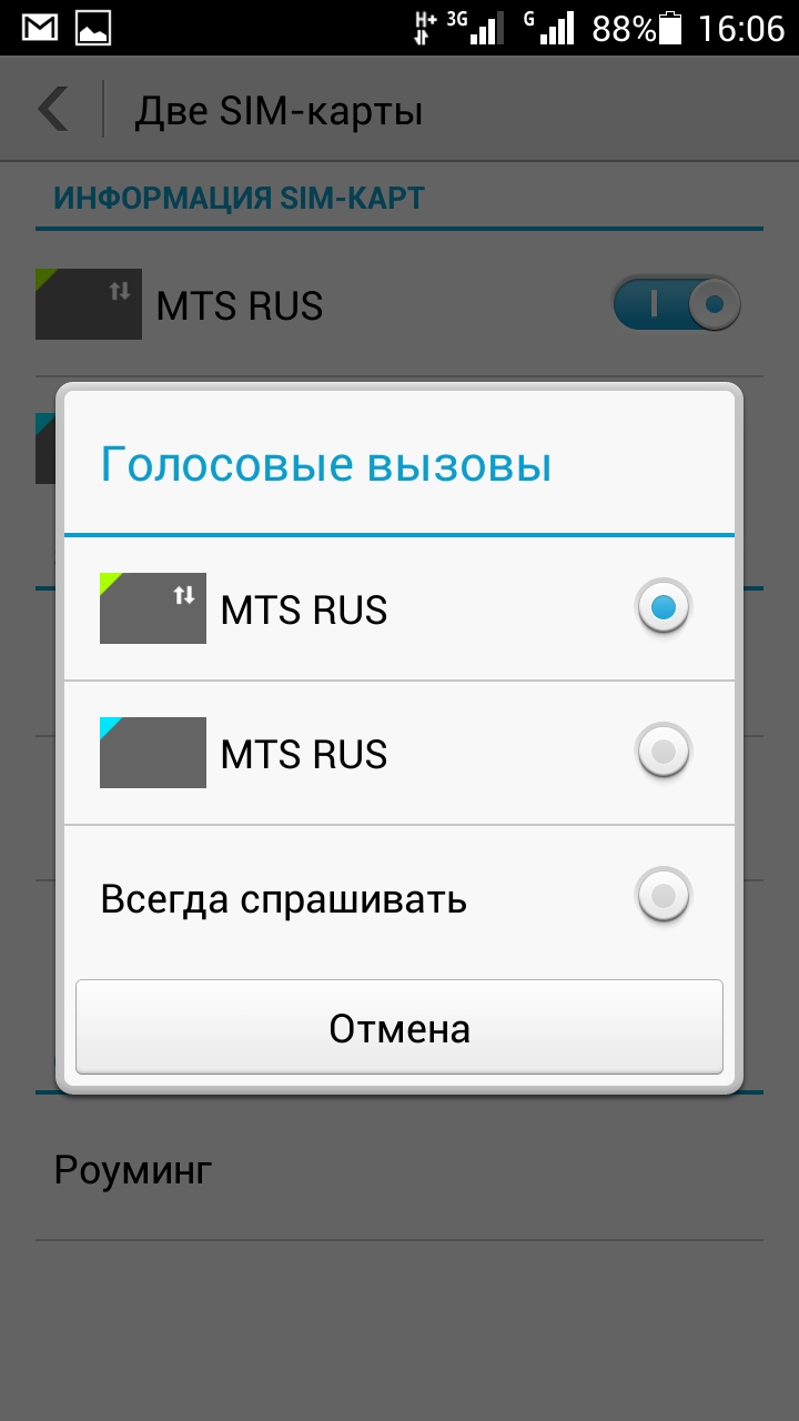 При использовании двух SIM-карт можно выбирать карту по умолчанию, или заставить смартфон каждый раз спрашивать пользователя, какую из них использовать.