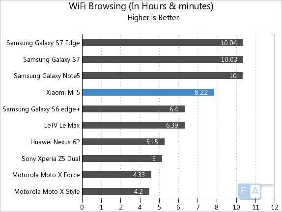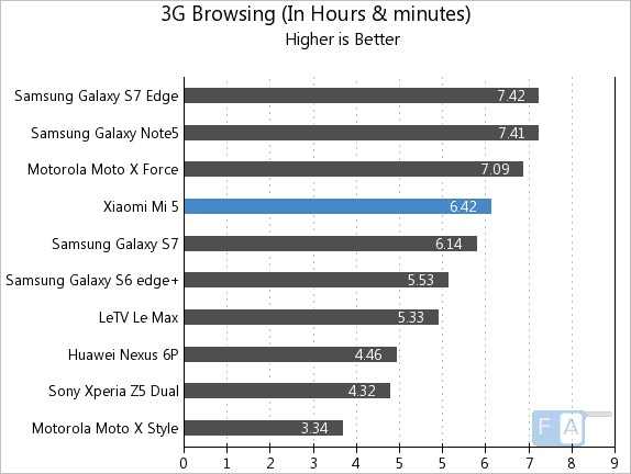 Но не все так однозначно, Xiaomi Mi5 проигрывает тому же Galaxy S7 Edge по времени серфинга в сети интернет.