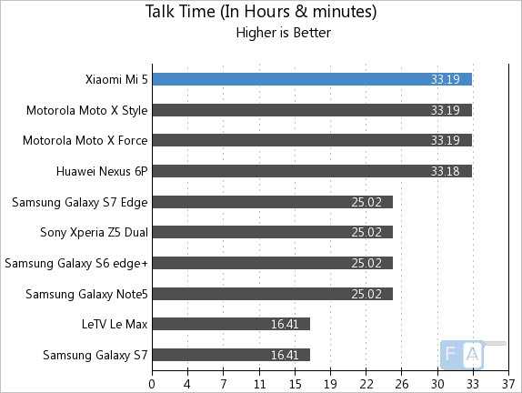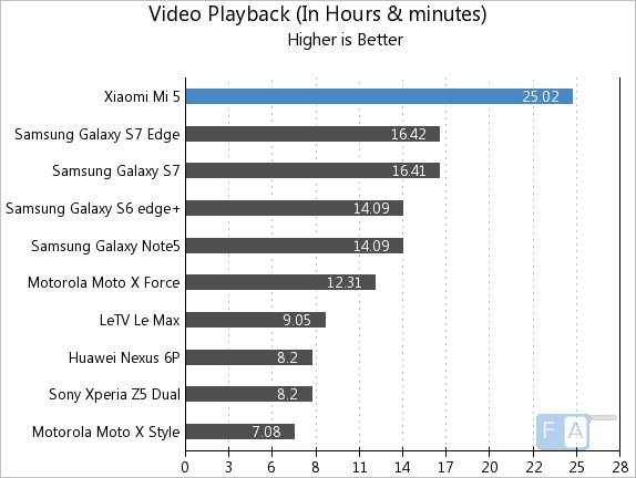 Теперь рассмотрим результаты тестов на автономность работы. Xiaomi Mi5 не сплоховал и в части тестов оказался лидером среди конкурентов. К примеру девайс может воспроизводить видео в течении 25 часов, для сравнения Galaxy S7 не дотянул до 17 часов.