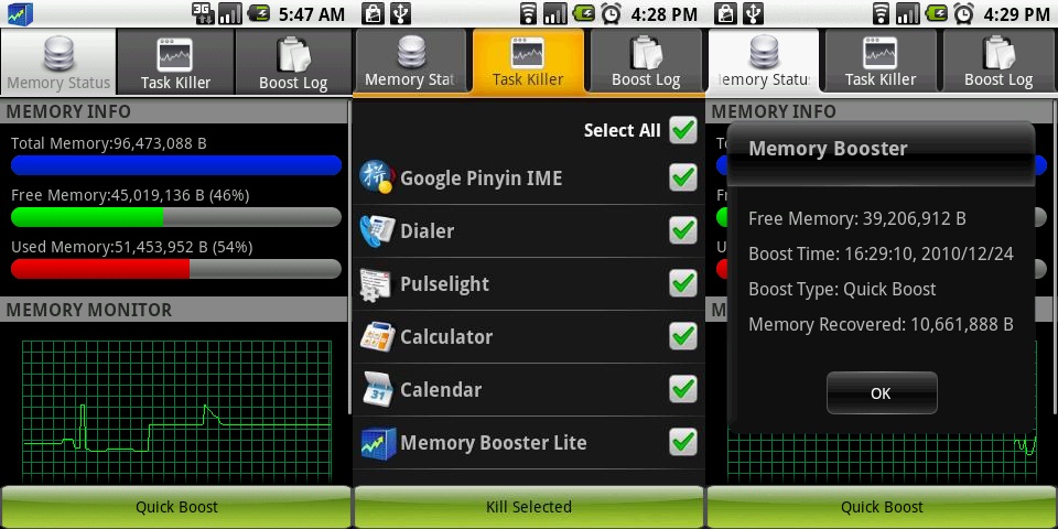 Memory Booster Lite — очень даже неплохая утилита для повышения производительности устройств на мобильной ОС Android. Она предназначена для освобождения памяти вашего девайса от неиспользуемых данных, пытается устранить утечки и дефрагментирует память. Весь комплекс действий позволяет добиваться от вашего устройства более шустрой и отзывчивой работы, так же ускорится запуск остальных приложений и их стабильность. Кроме всего прочего уменьшится расход батареи, так как не будут запущены не используемые сервисы. В программе присутствует быстрая оптимизация, одной кнопкой.